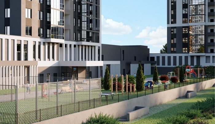 На территории комплекса будут установлены спортивные и детские площадки для разных возрастных групп.