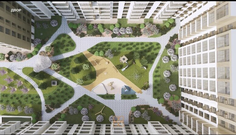 Круглогодичные дворы-скверы: летом — игровые зоны с безопасными аттракционами, зимой — веселая снежная горка.