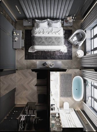 С мастер-спальней, просторными гардеробными, естественным светом благодаря окну в ванной и уютной теплой лоджией.